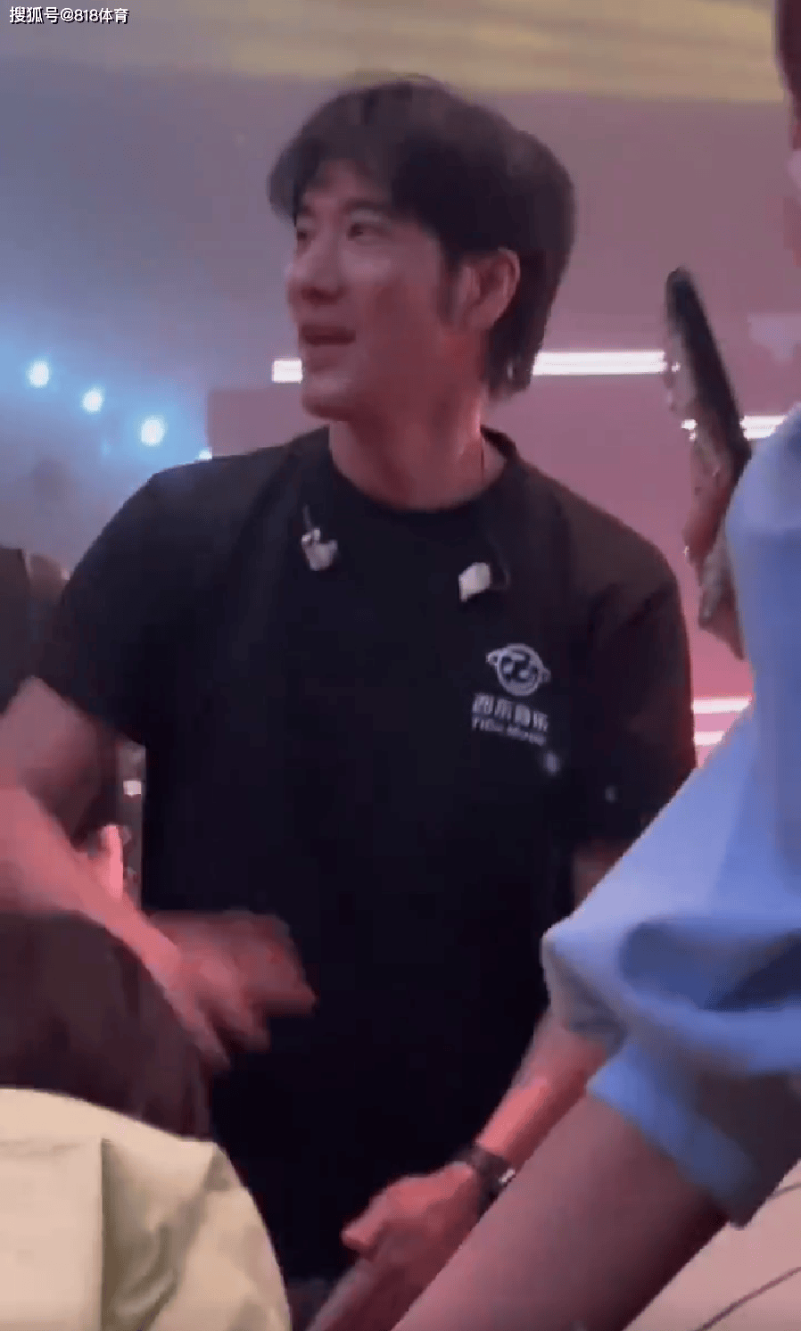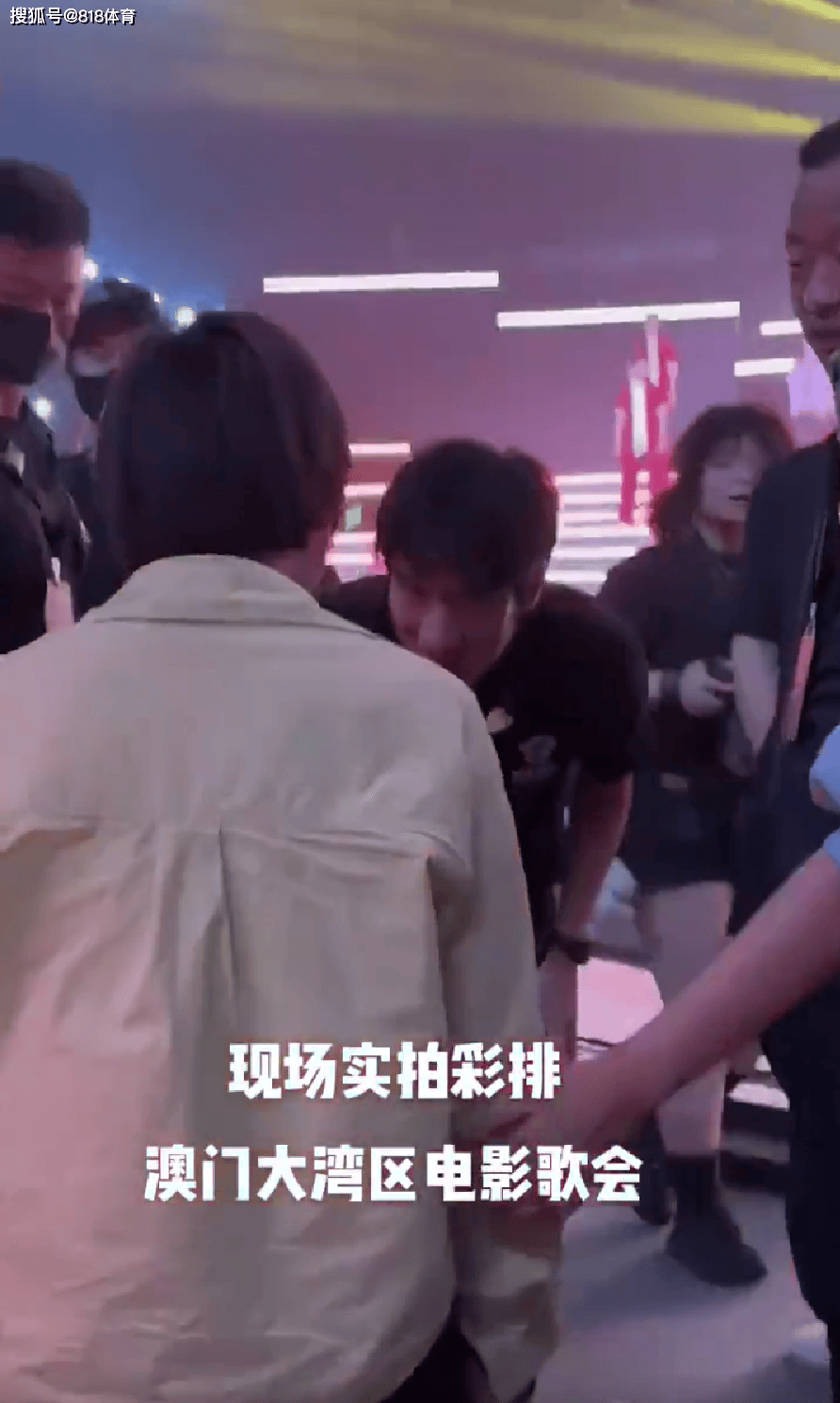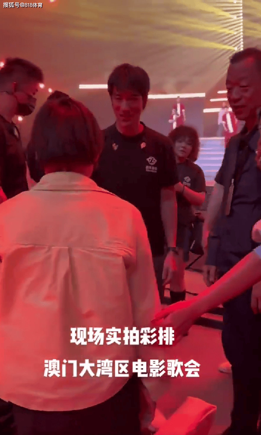 在晚会开始之前的大湾区电影音乐晚会彩排现场, 王力宏看到了坐在场边候场的全红婵,于是主动走了向坐在椅子上的婵宝宝打招呼。
